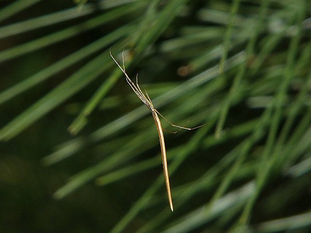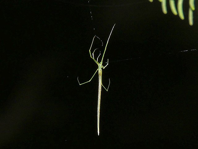 非常に細長く、一般的なクモの外見とはかけ離れている。色調は緑色型と褐色型が知られる。食餌は他のクモを襲って食べるそうである。